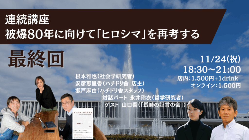 被爆80年8月に向けて『ヒロシマ・パラドクス』著者の根本雅也さん、哲学者の永井玲衣さんと共に行うシリーズ企画も、いよいよ今回で最終回です。