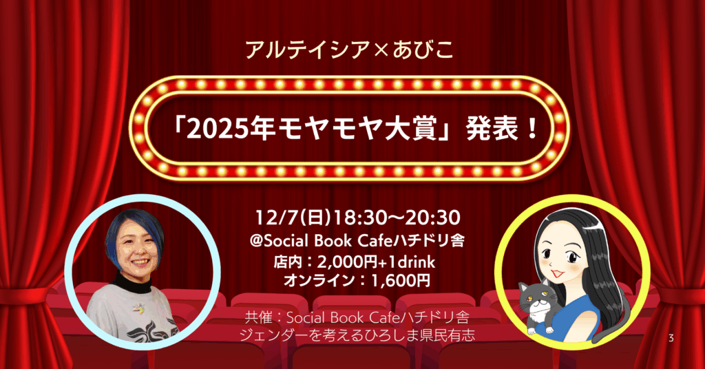 『だったら、あなたもフェミニストじゃない?』の著者であり、「ジェンダーしゃべり場」などハチドリ舎でも登壇されたアルテイシアさんと、ハチドリ舎店主の安彦恵里香が、今年1年を振り返りながら「モヤモヤ大賞」を発表します!
