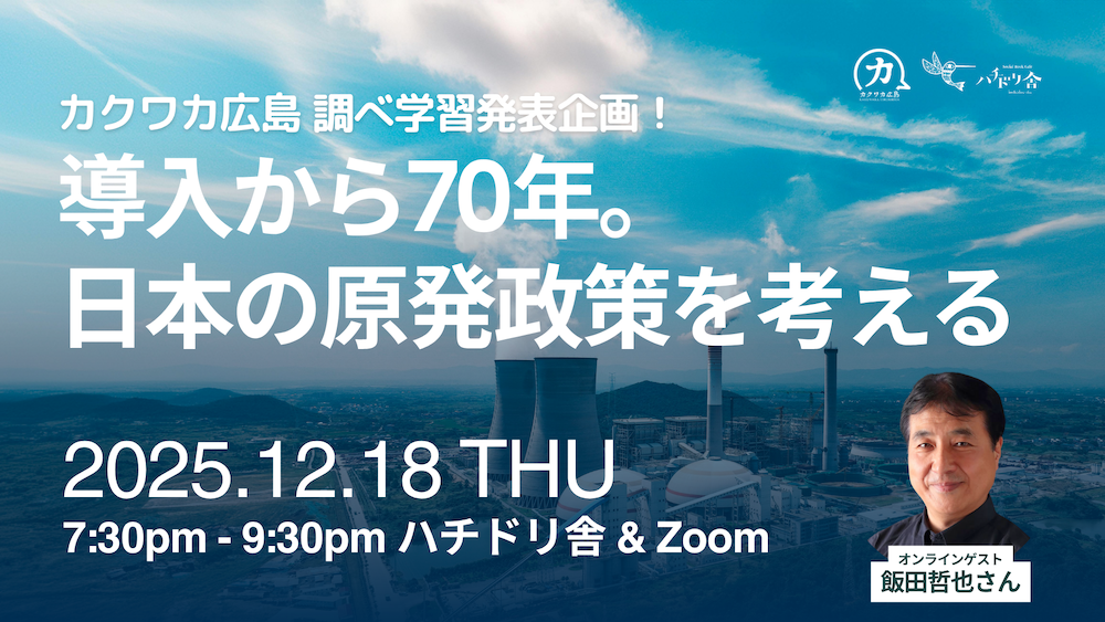 当日は、カクワカ広島メンバーが気になるテーマをそれぞれ選んで調べ学習し発表。オンラインゲストの飯田哲也さんに内容を受けてコメントいただく予定です。