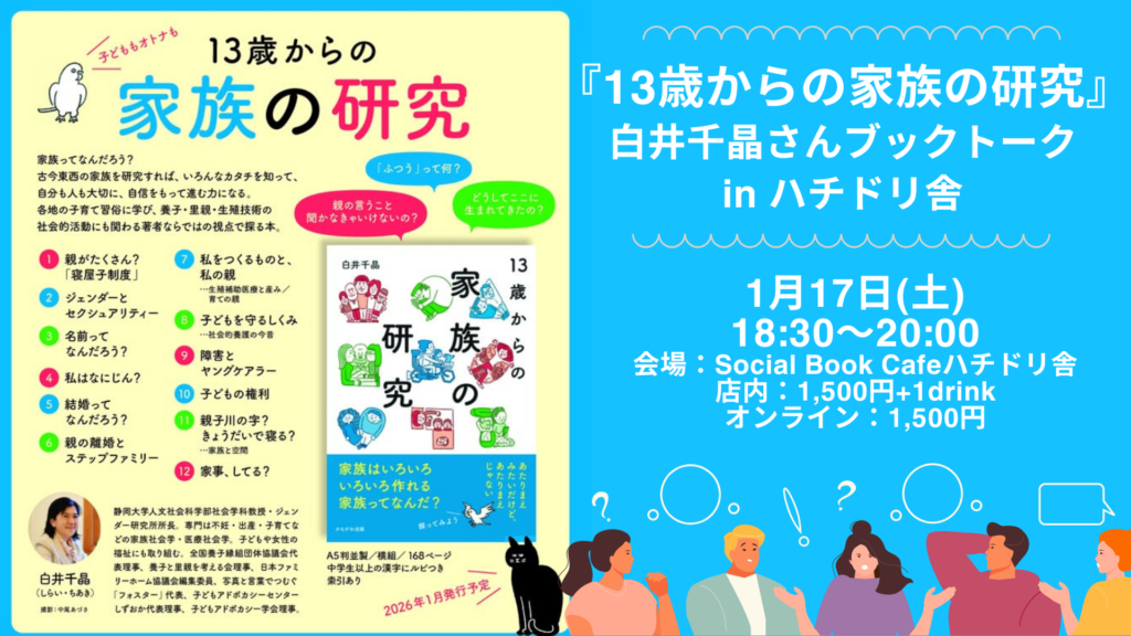『13歳からの家族の研究』(白井千晶著、かもがわ出版、2026年)から皆さんが興味のあるトピックを共有し、意見交換したいと思います。