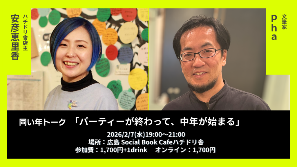 近著『パーティーが終わって、中年が始まる』で、20代〜30代の若さの魔法がとけて、一回きりの人生の本番と向き合う日々を綴ったphaさんと、実は同い年の店主あびこのトーク。ぜひ一緒に聞いてみませんか。