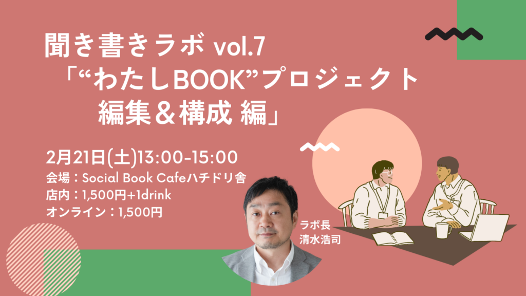 ラボ長の清水浩司による「聞き書き」を通じた交流の場。現在進行中の“わたしBOOK”プロジェクトは、参加者が互いに聞き書きをしながら、自分のヒストリー/ストーリーを振り返る16ページの冊子を作成するワークショップシリーズ。