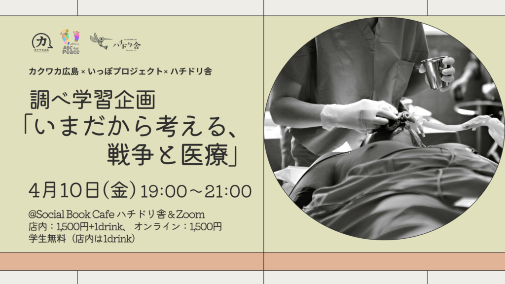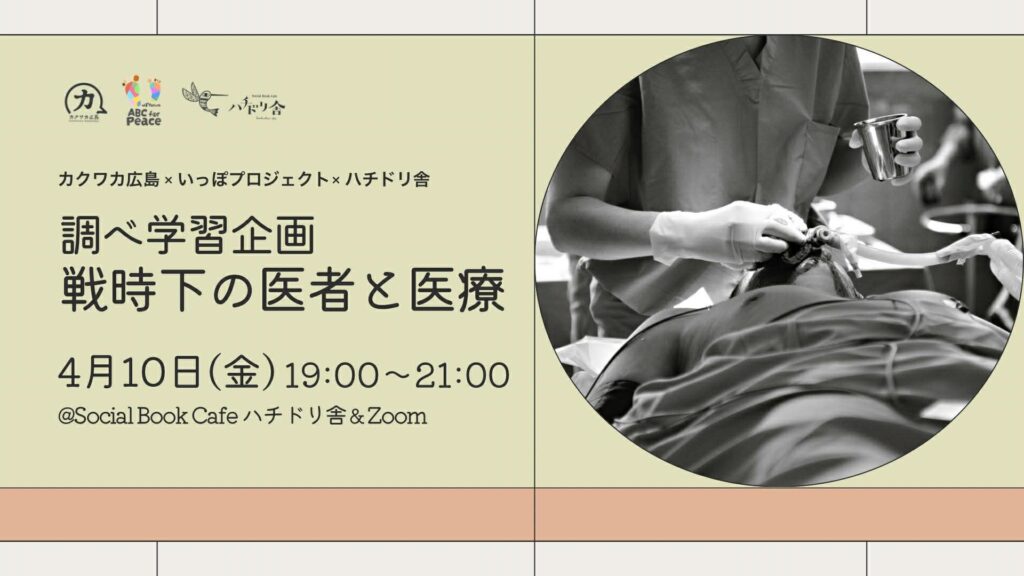「そういえば、戦争中はお医者さんってどうなるんだろう」ふとした疑問から生まれた調べ学習企画です。改憲やさらなる軍拡が進む危機感が強まる今だからこそ、具体的に戦争の中で医療はどう変えられてしまうのかを考えたい。